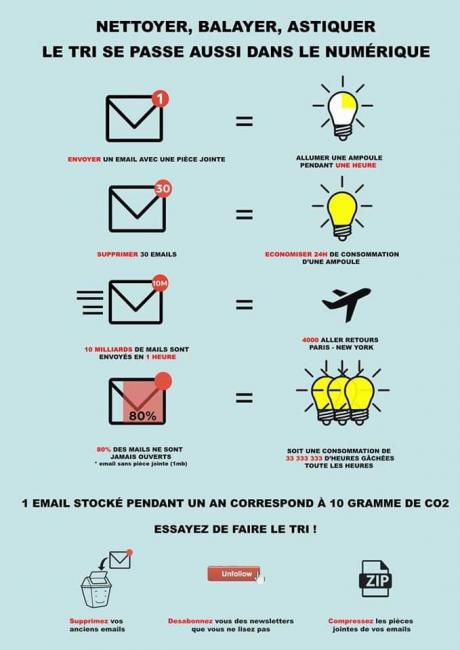 Par exemple, il est aussi intéressant de prendre conscience qu’un mail stocké pendant 1 an correspond à 10 grammes de CO2. Le simple fait de les supprimer est devenu un geste écoresponsable au regard du nombre des mails émis mondialement !
